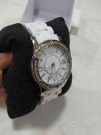 Elegante orologio da domma con cinturino in ceramica bianca con chiusura a scatto, cassa con ghiera con strass, quadrante bianco con indici strassati, imperneabile a 3atm.,di J Lo di Jennifer Lopez, usato ma in ottime condizioni, stupendo.