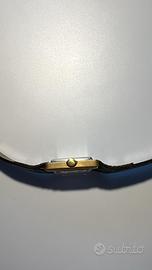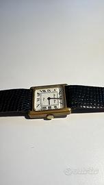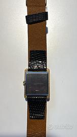 Vendo orologio da polso Mercedes-Benz originale, modello meccanico a carica manuale, dal design elegante e intramontabile. La cassa rettangolare dorata racchiude un quadrante bianco con numeri romani e lancette nere in stile classico. Il cinturino è in vera pelle nera con effetto lucertola e fibbia dorata abbinata.