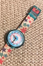 Orologio Flik Flak da bambino con cinturino in tessuto lavabile in lavatrice a fantasia di stelle multicolori.