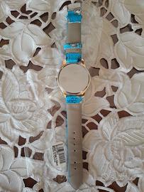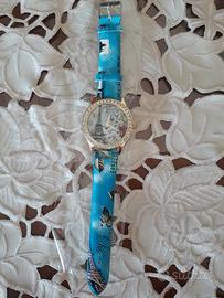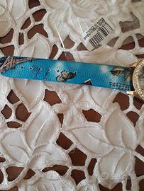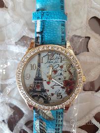 Elegante e particolare grande orologjo con quadrante dorato di diametro 4 cm. e cinturino azzurro con tema Parigj: all'interno la Torre Eiffel, cuoricini e scritte Love, così anche sul cinturino azzurro. All'esterno ci sono dei brillantini da bigiotteria. Nuovo. Funzionante come da lacetta dei secondi sulle foto. Si può abbinare ai set bigiotteria che ho messo in vendita. Se interessati ad altri oggetti per unico pacco e sconto, cliccate sul mio profilo