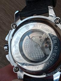 Orologio da polso con movimento automatico FUNZIONANTE. Condizioni generali ottime. L'articolo presenta alcuni difetti importanti: manca la lancetra dei secondi; manca ll vetro e probabilmente la ghiera. Le lancette di minuti e ore sono staccate ma disponibili. Cinturino in gomma effetto pneumatici. Larghezza 50mm. 3ATM water resistant. Parti metalliche in acciaio inossidabile.
