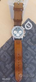 Elegante orologio da polso con cinturino in pelle marrone e cassa in argento.