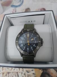 orologio da polso con cinturino verde quadrante scuro con numeri arabi lunetta girevole con indici lancette gialle e bianche.