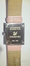 Orologio da polso Swarovski autentico, modello fuori produzione e da collezione. Design elegante con cassa quadrata in metallo lucido e cristalli Swarovski incastonati su tutti e quattro i lati. Quadrante color argento minimalista con logo a ore 12. Cinturino in pelle rosa chiaro con segni di usura e un piccolo pezzo leggermente staccato (danno minimo che non compromette l’uso). Movimento al quarzo, perfettamente funzionante. Buone condizioni generali, ideale per collezionisti o amanti di accessori raffinati e vintage Swarovski.