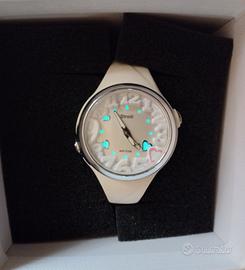 Orologio di tendenza, leggero e colorato, di lato è presente un pulsantino che produce una luce (foto 2) all'interno del quadrante per mettere in evidenza gli indici e i cuoricini in traforo.