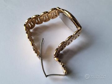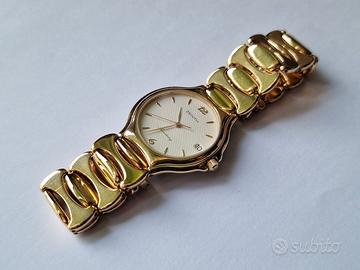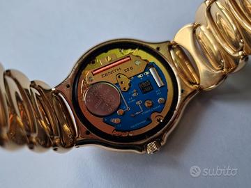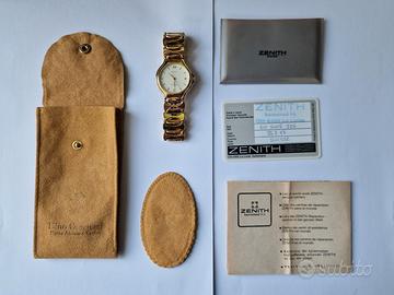In vendita orologio da polso ZENITH modello ACADEMY ref. 50 6000 226. Donna e uomo, unisex. Resistente all'acqua. Orologio di lusso molto elegante di manifattura svizzera ZENITH datato 23 febbraio 1988. MADE IN SWISS Bracciale in acciaio inossidabile placcato in oro giallo da 10 micron e lucidato, chiusura pieghevole doppia nascosta. larghezza di 1,9 cm. misura tasselli piccoli: 1,3 x 0,6 cm misura tasselli grandi: 1,9 x 0,9 cm Quadrante da 2,6 cm di diametro, presenta in numero il 6 e il 12, mentre gli altri numeri sono segnalati con delle lineette. Piccolo riquadro a destra per la data. sfondo texturizzato color bianco crema. Indicazione di ore, minuti e secondi tramite lancette centrali. Vetro in cristallo di zaffiro antigraffio. Cassa in acciaio inossidabile da 3,5 cm, retro avvitato con 4 piccole viti. Orologio al quarzo con 7 rubini. Scritte esterne: - water resistance - base metalbezel - stainless steel back - 50 6000 226 - acier inox Scritte interne: - Zenith 22.6 - M903 1871 - unad justed - seven 7 jewels - ass eol - Swiss vb - r/t Assieme è presente una custodia per carte (9 x 5,6 cm) contenente la garanzia e il foglietto del tempo che illustrava tutti i centri di assistenza ZENITH e anche una custodia color camoscio con bottone dorato a pressione con all'interno anche, dello stesso materiale, un ovale porta orologio. Condizioni pari al nuovo, mi è stato regalato per inutilizzo delll'ex proprietario. Da me mai utilizzato se non per cambiargli la pila ogni volta che si scaricava (pila SR920 W). Tutti i dati tecnici presenti nell'annuncio sono stati trovati e riportati da siti e negozi ufficiali. Per richieste, contattare tramite la chat di Subito.it oppure scrivere al numero 3477427069 SOLAMENTE tramite Whatsapp oppure chiamare al numero 0331795173 da lunedì a venerdì di mattina (8:30-12:00) o di pomeriggio (14:00-17:00). Consegna a mano con pagamento in contanti oppure spedizione e pagamento con Subito.it (con spese a carico dell'acquirente).