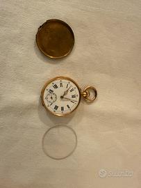 L’orologio da tasca e’ un pezzo francese del tardo XIX secolo (probabilmente fine 1800 - primi 1900), di tipo “remontoir” con cassa in oro giallo, quadrante smaltato bianco con numeri romani, sub-dial per i piccoli secondi a ore 6, lancette a serpente o stile “bleu” tipiche dell’epoca.