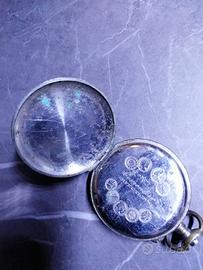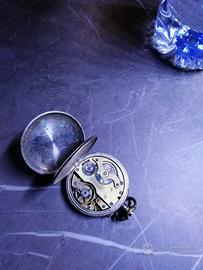 Orologio da tasca antico "Remontoir Perfectionné" - Meccanico a carica manuale - Primi '900 Splendido orologio da tasca d'epoca con movimento meccanico a vista (carica a corona, sistema Remontoir). Il quadrante in ceramica bianca presenta numeri arabi classici e un raffinato logo centrale "Oris Patent". Dettagli Tecnici: Movimento svizzero con ponti in ottone, bilanciere visibile. Cassa: Cassa in metallo brunito o argento (da verificare se presenti punzoni all'interno), decorata sul retro con l'incisione "Remontoir Perfectionné" e medaglie d'onore dei premi dell'industria orologiaia dell'epoca. Quadrante: In smalto/ceramica bianca (presenta lievi segni del tempo/filature che ne attestano l'originalità). Stato di conservazione: L'orologio si presenta nel suo stato originale "da ritrovamento". La patina esterna e i segni sul quadrante donano un fascino autentico da pezzo da collezione. Le lancette non sono presenti (o non visibili in foto). Ottimo come pezzo da esposizione, per collezionisti di orologeria d'epoca o per progetti di restauro.