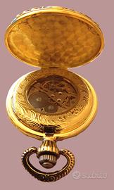Segnatempo a carica manuale con catenella. Questo orologio per funzionare deve essere caricato. Prima della spedizione ne sarà controllato il funzionamento e si procederà ad imballarlo accuratamente. Orologio particolarmente appariscente, di grande spessore e ricco di elementi decorativi. La cassa ha il bordo in metallo color oro con inserti in smalto nero, il centro con meccanismo a vista e le ore su un cerchio dorato. La scena del coperchio ritrae Dafne ed Eros insidiate da un amorino. Spedisco, nelle trentasei ore dal saldo, con impacchettamento atto a scongiurare eventuali danni da trasporto.