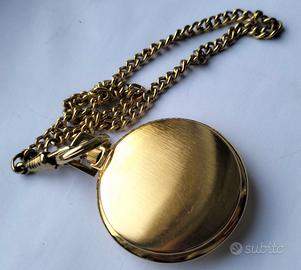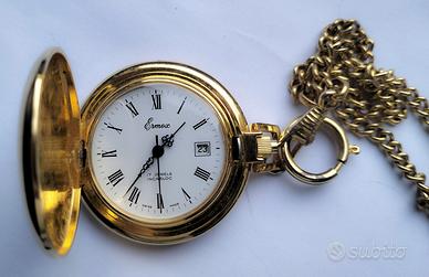 Elegante orologio da tasca Ermex Lepine 17 Jewels Incabloc (Swiss Made), funzionante, stile Lepine con datario. Un pezzo classico, perfetto per un regalo o per amanti del genere. •Movimento: Meccanico a carica manuale 17 Rubini con protezione Incabloc. •Cassa: Laminata oro, molto sottile ed elegante. Diametro 42mm •Quadrante: Bianco ceramico con numeri romani e datario a ore 6. •Condizioni: Eccellenti, sembra quasi un fondo di magazzino. Incluso di catenina coordinata.