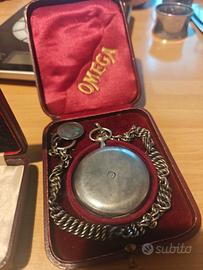 splendido orologio da taschino Omega originale dei primi del '900, un pezzo di storia dell'orologeria svizzera in condizioni di conservazione eccellenti. Periodo: 1910-1915 (identificato tramite numero di serie 4.711.899). Cassa: In argento con raffinata lavorazione guilloché sul retro. Diametro classico. Quadrante: In smalto bianco con numeri arabi, piccoli secondi a ore 6. Esteticamente impeccabile, senza crepe o filature. Meccanismo: Calibro premiato al Grand Prix di Parigi del 1900, a carica manuale. L'orologio è perfettamente funzionante. Storia: Il fondello interno riporta rare incisioni manuali di revisioni storiche datate 1926 e 1937, a testimonianza della cura ricevuta nel tempo. Accessori inclusi: * Scatola originale Omega dell'epoca in velluto e seta bordeaux (rarissima da trovare completa). Catena vintage con medaglietta originale. L'orologio è stato conservato con estrema cura. Il movimento è fluido e tiene bene il tempo. Segni di usura del tutto naturali per un oggetto di oltre 110 anni, che ne certificano l'autenticità.