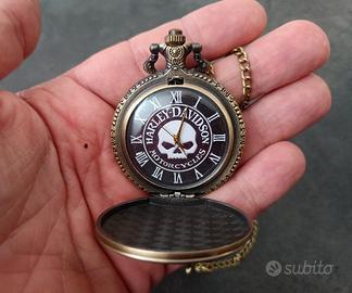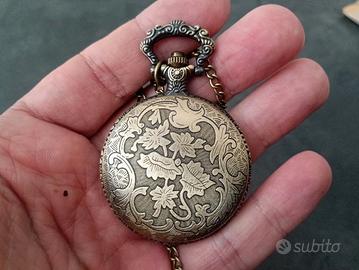 orologio da tasca con catena. corpo in metallo color bronzo, quadrante nero. nuovo. POSSIBILE SPEDIZIONE IN TUTTA ITALIA. PREZZO NON TRATTABILE.