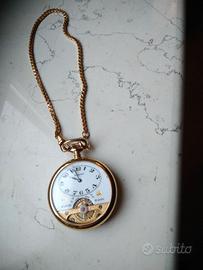 Orologio da tasca Hebdomas placato in oro con movimento a vista e carica manuale 8 JOURS. Carica manuale con riserva di carica di 8 giorni, calibro Hebdomas.L'orologio ha una cassa doppia da 50 mm in metallo placcato in oro, con fondello apribile a cerniera, peso 110 grammi, con catena. Quadrante in ceramica bianca, con bilanciere visibile.