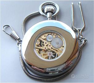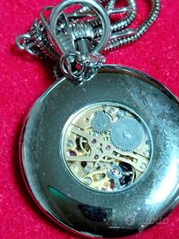 Bellissimo orologio da tasca dalla linea moderna e liscia color argento, a carica manuale. Il quadrante è il punto di forza di questo modello, con una banda colorceleste/ blu al cui interno è inserita la grande numerazione di tipo arabo, color argento lucido. Al centro è presente un oblò da cui si può vedere il meccanismo. Anche la parte posteriore si presenta liscia lucida con oblcentrale da cui si può ammirare il meccanismo. Il diametro è di circa 50 mm. La catena in dotazione è lunga circa 35 cm e presenta le maglie tubolari note come “coda di topo”.