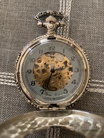 Vendo orologio da tasca meccanico “Isaac Newton”, in ottime condizioni estetiche e funzionali. Modello elegante con quadrante skeleton che mostra gli ingranaggi interni e cassa argentata con incisioni decorative. Caratteristiche principali: Movimento meccanico a carica manuale Quadrante skeleton con ingranaggi a vista Doppia scala 12/24 ore Cassa incisa in metallo argentato Design classico, ideale per collezionisti o come accessorio elegante Perfettamente funzionante Ottimo come idea regalo o per chi ama gli orologi vintage dal look raffinato.