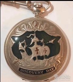 Movimento meccanico a carica manuale perfettamente funzionante. Cassa argentata con riflessi dorati raffigurante l'immagine della Scoperta del Nuovo Mondo con incisioni celebrative Caravelle Discovery Day. L'altro lato presenta incisione Cristoforo Colombo. Quadrante con numeri Romani, datario e gancio per catenella. Accessorio d'epoca di alta classe e rarità.