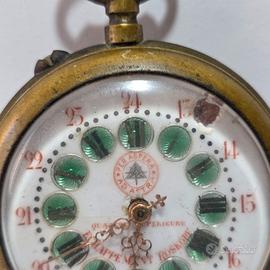 Orologio da tasca epoca 1890/1910 con scappamento Roskopf e quadrante con indici a medaglioni verdi smaltati riportanti la dicitura "Echappement Roskopf" e il marchio "Per Aspera Ad Astra" con logo stellato. Venduto come non funzionante per recupero pezzi o restauro. Mancano componenti come la corona di carica e il bilanciere presenta un movimento irregolare e a tratti. La cassa in bronzo e il vetro mostrano segni del tempo e usura coerenti con l'epoca, lievi graffi, buona patina. Nel quadrante manca smalto in prossimità degli innesti. vintage watch timepiece classic mechanical manual antique timeless preowned reloj clasico mecanico antiguo estilo ocasión uhr klassisch mechanisch antik stil gebraucht orologio classico automatico depoca usato montre classique mecanique ancienne intemporel occasion horlogerie automatique cronograph crono cronografo cronometre pocket da tasca taschino XIX XX