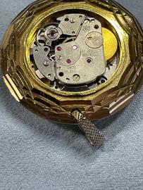 La cassa è riccamente lavorata con finitura sfaccettata color oro; sul retro è presente una decorazione smaltata a mano con motivo floreale (rosa), che rende l’orologio particolarmente decorativo e raffinato.