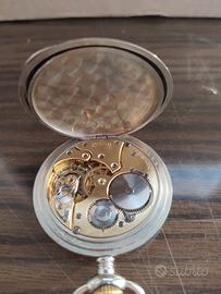 orologio da tasca ZENITH anno 1920 (datazione da numero di serie impresso sul movimento 2.491.630). Ha la cassa ed il coperchio copri polvere marcato ZENITH, con numero seriale 4.924.420. L'orologio è corredato della sua scatola marcata ZENITH in pelle marrone con lievi segni del tempo. La carica avviene tramite la corona così come la rimessa dell'ora. Il vetro è senza graffi ed il quadrante in ceramica bianca è immacolato senza spaccature ne "filature" o riparazioni, con la scritta ZENITH ad ore 12. Sul quadrante e nella secondiera, ad ore 6, sono impressi i numeri in stile arabo ed ha sul quadrante una seconda numerazione in colore blù per le 24 ore. Ha la ghiera porta vetro ed il coperchio della cassa posteriore che chiudono perfettamente e le cerniere sono toniche, con lievissimi segni del tempo ed è praticamente conservato in ottime condizioni. La cassa dell'orologio è lucida ed il movimento, con MICRO REGOLATORE, tiene bene il tempo. Le misure sono: diametro cassa 48,75 mm., con corona 60,65 mm., con anello 69,50 mm., spessore 13,25 mm., peso 83,70 grammi.