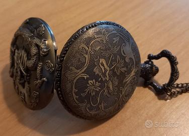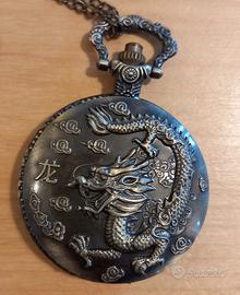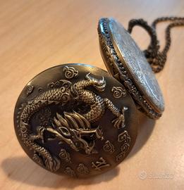 Orologio in bronzo con disegno Drago cinese e catenella da taschino Meccanismo con movimento al quarzo Viene venduto senza batteria