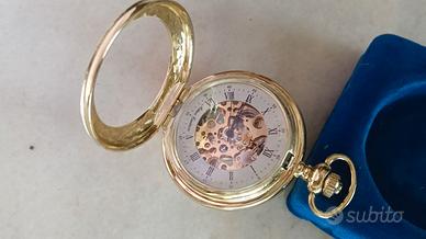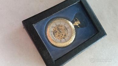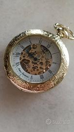 Orologio da Tasca scheletrato, movimento meccanico a vista che mostra gli ingranaggi interni . Design elegante con finitura dorata, classico quadrante con numeri romani.