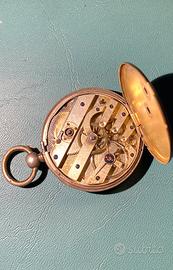 Orologio da taschino francese databile intorno al 1860 con scappamento ad ancora laterale con contrappeso, carica e rimessa all'ora tramite chiave, spirale del bilancere da sostituire, per pezzi di ricambio o restauro