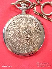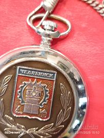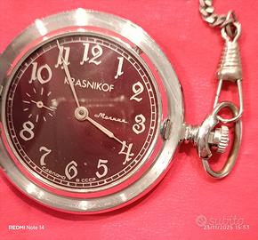 Orologio russo da taschino Krasnikov Molnija, quadrante bordeaux e parte esterna della cassa tutta incisa. in acciaio e carica manuale.