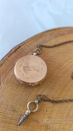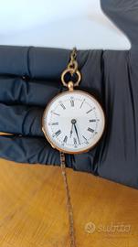 Orologio da Taschino da Collezione Mermod Geneve Cylindre 10 Rubis, FUNZIONANTE. A doppia cassa in oro 18 kt. Quadrante a smalto bianco con numeri romani agli indici. Presenta catenina e chiave di ricarica in oro anch'essi. Il retro dell'orologio in oro presenta decorazione di un paesaggio con cornice floreale. Movimento meccanico a carica manuale. Diametro quadrante 30 mm. Prezzo Trattabile, no perditempo. Consegna di persona.