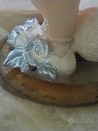 L'orologio presenta una base di marmo e decorazione in metallo dorato è affiancato da due statuine decorative un ragazzo che ha in mano uno strumento musicale e l'altra una ragazza con un cane.