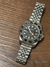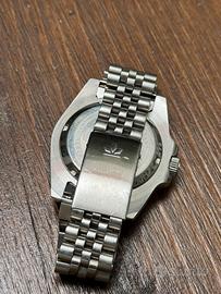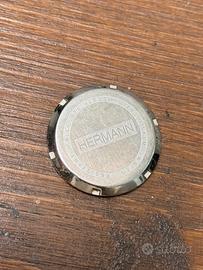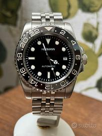 Orologio da uomo automatico marca Hermann in acciaio e con bracciale con maglia jubilee (ha tutte le maglie quindi adatto anche ad un polso grande). Orologio perfettamente funzionante e super luminescente al buio, inoltre monta un movimento automatico Myota preciso! L’orologio misura 42 mm (esclusa la corona). L’orologio presenta alcune imperfezioni sotto la lunetta in varie ore (si nota dalle foto ed il prezzo ne tiene conto)