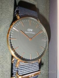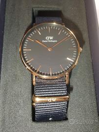 Orologio Daniel Wellington Classic 36mm – Quadrante nero, cassa oro rosa, cinturino NATO Vendo orologio Daniel Wellington Classic, modello B36R15, 36mm, quadrante nero con lancette e indici oro rosa, cinturino NATO nero originale. Movimento al quarzo Japan, cassa in acciaio inossidabile, resistente all'acqua 3ATM. Indossato pochissime volte, in ottime condizioni. Sul retro sono presenti leggerissimi graffi superficiali dati dal contatto col cinturino, visibili nelle foto, che non si vedono quando indossato. Il quadrante e la cassa frontale sono perfetti. La batteria attualmente inserita non è funzionante. Per questo motivo includerò nella spedizione una batteria nuova SR626SW pronta per la sostituzione. La messa in opera è a carico dell'acquirente: si tratta di un'operazione semplice che consiglio di far eseguire da un orologiaio per evitare di aprire la cassa senza gli strumenti adatti. Venduto con scatola originale Daniel Wellington (la confezione esterna ha qualche segno perché è stata consegnata in queste condizioni). ⌚ Cassa 36mm oro rosa 🖤 Quadrante nero con indici oro rosa 🖤 Cinturino NATO nero originale 🔋 Batteria nuova SR626SW inclusa nella spedizione 📦 Scatola originale inclusa ✅ In ottime condizioni