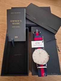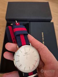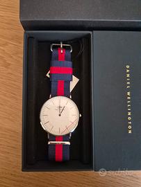 Vendo splendido orologio Daniel Wellington, modello Classic Oxford con cassa in finitura argento e l'iconico cinturino in tessuto blu e rosso.