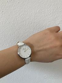 Orologio donna di Daniel Wellington (Petite Sheffield, 28mm) che non si trova più sul sito ufficiale, prezzo pieno 120+eur. Usato solo poche volte. In acciaio lucidato 316L. Spessore della cassa 6mm. Cinturino in pelle bianca (larghezza 11mm), pila cambiata. Lunghezza regolabile(Min - Max) 145-185mm. Resistente all’acquafino a 3ATM (Resistente alla pioggia). Ha un piccolo difetto sul vetro di quadrante (22x22mm), si vede nelle foto. Per questo il prezzo è abbassato.