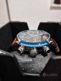 Orologio Diesel Overflow. Questo orologio da uomo si distingue per l'imponente cassa in acciaio inox da 49 mm e un design accattivante con dettagli blu e argento. Il quadrante con sottoquadranti e il cronografo all'interno offrono precisione e stile. Il cinturino in pelle marrone garantisce comfort nell'uso quotidiano. Ideale per chi cerca un orologio con carattere e funzionalità.