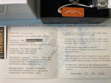 Vendo orologio automatico acquaforte 200, Lamberti Orologiai, vetro zaffiro, impermeabile 200 metri, modello 22620, lunetta in ceramica, ghiera in acciaio unidirezionale con 120 scatti.