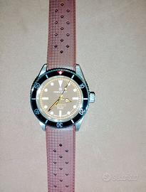 Diver Gigandet automatico, cassa da 38 mm, corona a vite, fondello a vite, quadrante color cioccolato, cinturino tropic marrone a sgancio rapido + bracciale originale in acciaio a maglie piene con perni a vite, anse cassa forate, super luminova su indici e lancette, movimento Seiko NH35 messo a punto dal tecnico Gigandet con certificato di regolazione. Dotato di corredo completo originale. Orologio pari al nuovo. Tipo Citizen Seiko