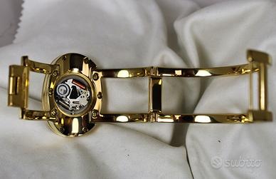 Cassa ovale dorata con quadrante color champagne. Marchiato sul quadrante DeG. Secondi al centro.