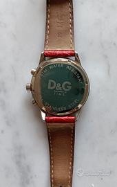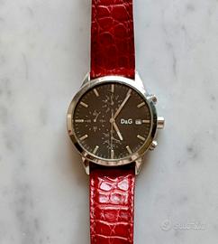 Orologio cronografo Dolce e Gabbana con datario, 5 ATM water resistant, alimentazione a batteria da sostituire, alcune lievi scalfiture sul vetro. Diametro del quadrante 4 cm. Cinturino in vera pelle, usurato.