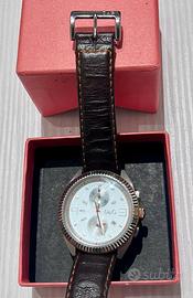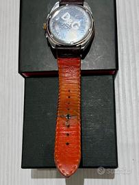 Orologio Dolce & Gabbana da uomo in acciaio con quadrante bianco e dettagli arancioni su quadrante e cuciture, stile vintage Y2K. Funzionante e testato, appena sostituita la batteria. Condizioni buone, graffi sul fondo e cinturino un pò consumato all'interno e normali segni di utilizzo. Design particolare e moderno, ideale per uso quotidiano o come accessorio vintage. Venduto senza scatola originale nè certificato.