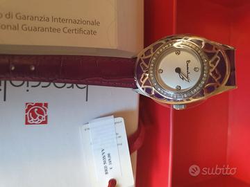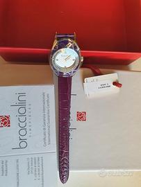 Orologio marca Braccialini – modello :BRD 503S/VV-Cassa: in acciaio 316L di forma ovale-Lunetta con Swarovski® e ‘rosa Braccialini’ stilizzata e impreziosita da smalto viola, corona zigrinata chiusa a pressione, vetro minerale-Diametro: 26 x 32 mm-Cinturino: in pelle viola-Quadrante: Apertura centrale rotonda rifinita da Swarovski® a contenere il quadrante argento, indici con Swarovski® applicati ai quarti-Sfere: in acciaio luminescenti-Movimento: Citizen 2025 al quarzo ad alta precisione con funzione di ore e minuti-Fibbia: in acciaio placcatura oro-Impermeabilità: 3 Atm- Cartellino euro 169,00