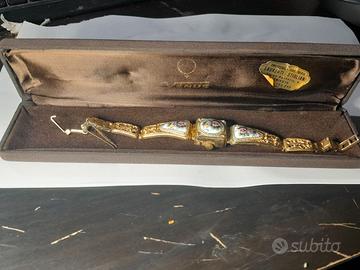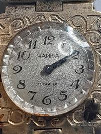 Marca:Chaika (Чайка), che significa "gabbiano" in russo, era anche il nominativo di chiamata della prima donna cosmonauta, Valentina Tereshkova. La fabbrica di orologi di Uglich è stata rinominata in suo onore nel 1963. Movimento: L'orologio è meccanico a carica manuale e presenta17 rubini(pietre) nel meccanismo. I rubini sono utilizzati per ridurre l'attrito tra le parti mobili e migliorare la longevità e la precisione dell'orologio. Origine: Prodotto in URSS (Unione Sovietica). Stile: Questi orologi sono considerati vintage e sono spesso ricercati per il loro design classico e la loro storia come oggetti d'epoca sovietica Caratteristiche :Il quadrante è di colore chiaro con numeri arabi neri e un motivo strutturato.I pannelli smaltati sono dipinti a mano con motivi floreali. Carica manuale, PERFETTAMENTE FUNZIONANTE. Se volete una prova con un video del suo funzionamento non esitate a chiedere. Astuccio dell'epoca ma comunque non originale CHAIKA. Dimensioni astuccio322x53 mm Peso complessivo(astuccio e orologio):112,4 grammi La richiesta è di 250€ più le spese di spedizione. Accetto solamente bonifico bancario tracciabile. Garantisco per la spedizione assicurata con Poste assicurata(12€), o con corriere a Vs. scelta(comunque da concordare). NON VENDO CON TUTTO SUBITO, per somma di pessime esperienza e nessuna tutela. Astenersi perditempo, massima serietà.