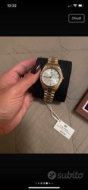 Everyday 34 mm, con cassa e bracciale in acciaio dorato, quadrante con pavé di brillantini e cristalli bianchi e rosa sulla ghiera.