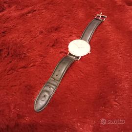 orologio donna Daniel Wellington quadrante tondo con brillantini al posto dei numeri e cinturino cuoio nero piccoli graffietti sul quadrante