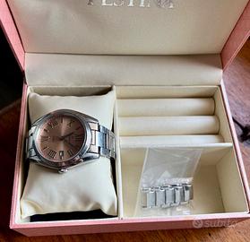 orologio donna Festina, in acciaio inox con quadrante rosa. Scatola originale. Braccialetto argento acciaio inox, all’interno della scatola è presente la restante parte del bracciale, in caso risultasse stretto. Cassa acciaio inox, movimento al quarzo, diametro della cassa 36,8 mm. Resistente all’acqua fino a 50 m. Dotato di datario, all’interno della scatola vi è il certificato di garanzia.