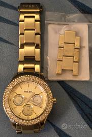 Vendo raffinato orologio Fossil femminile (referenza ES3101) in acciaio inox tonalità oro giallo. Design elegante e moderno, perfetto per ogni occasione grazie alla luce della ghiera impreziosita da cristalli. DATI TECNICI: Movimento: Quarzo analogico con funzioni cronografo. Dimensioni: Cassa da 37 mm, finitura gold lucida. Resistenza: Impermeabile fino a 50 metri (5 ATM). Accessori: Incluse le maglie originali per la regolazione del cinturino. STATO E ORIGINE: L'oggetto è in condizioni eccellenti, come visibile dalle immagini. Acquistato presso l'Orologeria Bellati (Ferrara), garantisco l'assoluta autenticità e sono disponibile per ogni verifica. Nota: Mancano scatola e scontrino essendo un regalo. REGOLE DI VENDITA: Prezzo: Importo fisso. Non si accettano ribassi o trattative. Gestione: Massima serietà. NON RISPONDO A CHAT O SMS. CONTATTO TELEFONICO: Per informazioni e per concludere l'acquisto, chiamare direttamente il numero: 📞 3 3 3 / 9 9 0 9 0 6 8 .