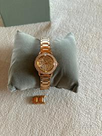 Design in oro rosa, con quadrante decorato da cristalli e cinturino in acciaio inox.
