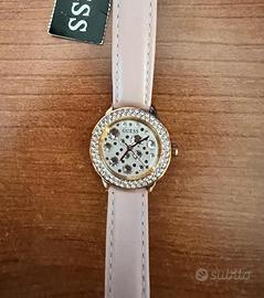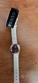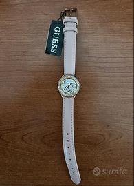 Orologio Guess nuovo, senza scatola, cassa di 25 mm in acciaio lucido oro rosa con cristalli trasparenti. Il quadrante è bianco con cristalli trasparenti. Il cinturino è in pelle rosa cipria.