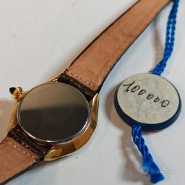 elegante orologio da donna meccanico a carica manuale. Marca K2 Watch. Cassa diametro 25mm. Cinturino marrone effetto pelle di coccodrillo. Cassa e quadrante colore oro. Perlina nera su corona. Nuovo, mai indossato, rimanenza di negozio.