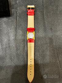 Orologio da polso vintage Mondaine Ancre 17 Rubis con cassa quadrata color oro e cinturino in pelle rossa effetto coccodrillo. Movimento meccanico 69-21.