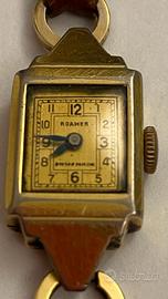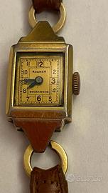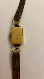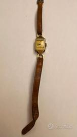 Orologio donna della casa svizzera Roamer famosa per orologi di buona qualità meccanica degli anni ‘40-‘50. Cassa dorata di acciaio placcato oro, quadrante rettangolare con numeri e lancette azzurrate e cinturino in pelle marrone un po’ rovinato. L’orologio non è funzionante ed ha segni di usura.